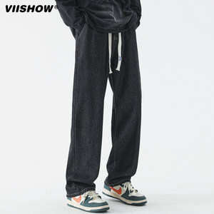 VIISHOW牛仔裤男春秋潮牌夏季美式复古休闲黑色长裤抽绳直筒裤子