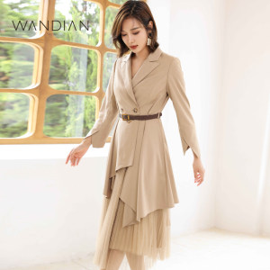 婉甸沙砾色拼接网纱长袖连衣裙春季压褶西装式假两件1231N13SJ3