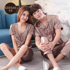 贵绣男士女士情侣丝绸睡衣 夏季短袖仿 真丝短袖套装两件套家居服