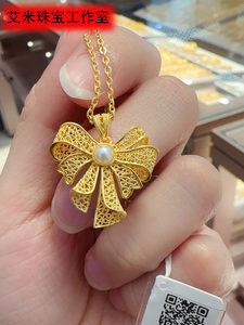 香港六福珠宝福满传家999.9足金计价套链黄金蝴蝶结珍珠项链女款