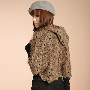 思美6 杰杰丝女装 潮流连帽钩花针织开衫时尚粗线毛披肩 春装 款