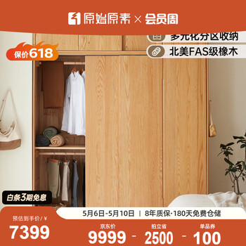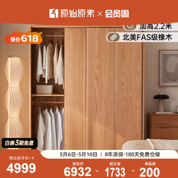 原始原素实木衣柜现代简约卧室柜子橡木储物柜推拉门衣橱衣帽间衣柜N1041 1.8米 原木色