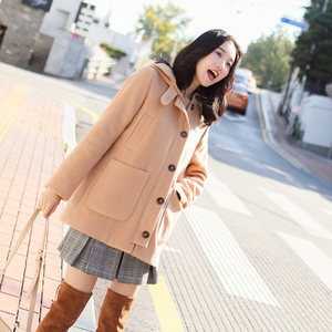 木木家.学院英伦风小圆领帽型呢大衣.显白经典驼短款毛呢外套女