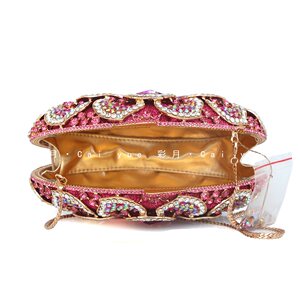 彩月手工镶钻名媛手拿晚装包2021玫红色立体花朵宴会包镂空镶钻包