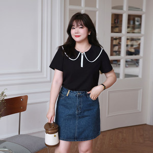 蓝若水大码女装时尚洋气娃娃领衬衫夏季胖MM显瘦复古藏肉炸街上衣