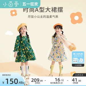 茵曼女童纯棉连衣裙2024春新款洋气时尚满印长袖娃娃领中大童裙子