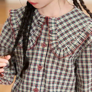 茵曼女童格子衬衣2024春新款长袖甜美荷叶边大翻领学院风衬衫儿童