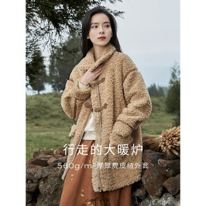 茵曼棉衣毛绒外套女士春秋2024新款加绒加厚羊羔绒棉服中长款大衣
