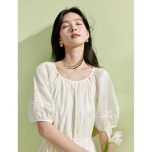 茵曼法式温柔风刺绣连衣裙女2024年夏季新款镂空系带收腰短袖长裙