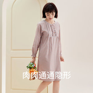 秋鹿撞色格子花边长袖睡裙女秋季梭织纯棉连衣裙居家圆领中裙秋款
