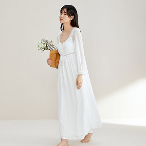 秋鹿蕾丝边梭织牛奶丝长袖睡裙女夏季v领丝绸长裙女款白色连衣裙
