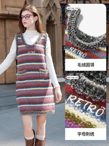 三彩2023冬季新款宽松彩色条纹字母针织连衣裙无袖背心裙垂坠感女