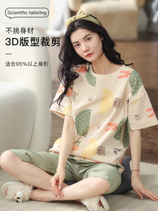 猫人纯棉睡衣夏季女士短袖七分裤2024年新款可外穿薄款居家服套装