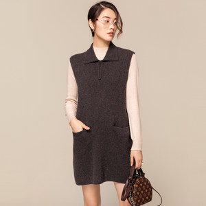 Q恒源祥中长款羊绒针织衫女秋冬新款polo领双口袋气质连衣裙毛衣