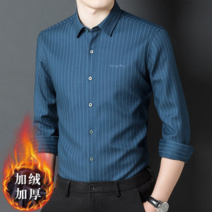 恒源祥中年男士加绒加厚衬衫男保暖衬衣男装冬季休闲免烫条纹上衣