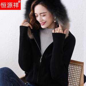 恒源祥貂绒毛衣外套女开衫带帽针织宽松连帽加厚秋冬新款狐狸毛领