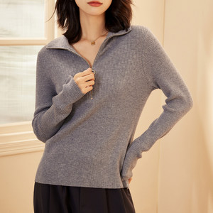 恒源祥弹力修身羊毛衫女秋冬新款拉链翻领套头毛衣休闲纯色针织衫