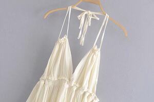 澳洲小众设计海岛度假小姐仙女裙蕾丝拼接深V性感露背挂脖吊带裙