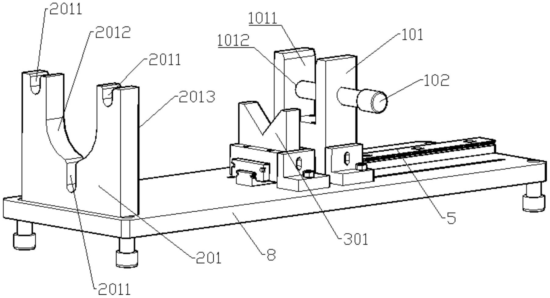 本实用新型属于汽车减振器技术领域,公开了一种汽车减振器支柱总成装车角度检测装置,包括底板,所述底板上沿安装方向设置有固定机构和检测机构,所述检测机构包括两个竖向间隔设置的检测面,两个所述检测面与安装方向平行设置,当将减振器支柱总成放在固定机构上时,所述固定机构对减振器支柱总成一端沿安装方向上进行定位,此时减振器支柱总成另一端的吊环两侧面分别与两个检测面相配合。对减振器支柱总成进行检测时,可将减振器支柱总成一端放在固定机构上进行定位,再将减振器支柱总成另一端的吊环沿其两侧面放入两个检测面间,当吊环能够正好落入到两个检测面之间且与检测面之间形成良好配合,则说明减振器支柱总成上吊环的安装位置为合格。