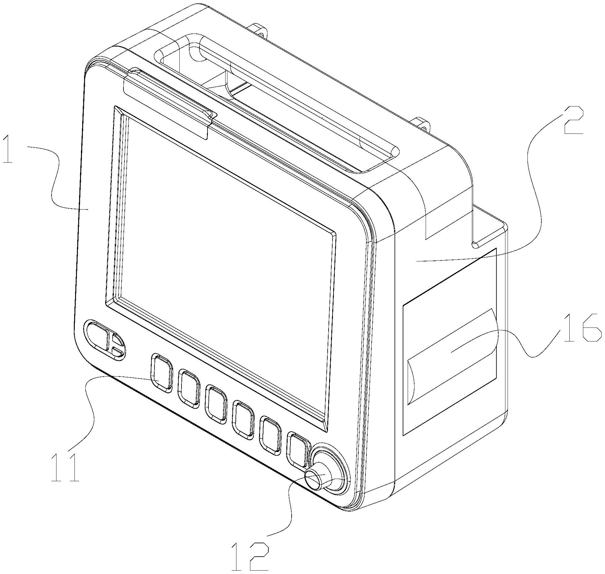 本实用新型提供一种新型监护仪,包括:前壳、后壳、电路板;所述电路板包括:多参数板、主控板、外部接口板、应用接口板、扩展功能板;所述主控板通过外部接口板与外部设备连接,所述多参数板通过应用接口板与若干传感器连接来获取人体参数;所述多参数板集成有心电数据处理模块、血氧数据处理模块、血压数据处理模块、开关电源处理模块及接口数据处理模块以实现对人体参数测量计算;所述扩展功能板与后壳上部设置的接口连接,功能扩展模块通过此处与主控板连接,提供扩展功能。本实用新型可以通过功能扩展模块进行功能扩展;通过按钮不同颜色实现提示功能,更易于观察到,便于医护人员及时进行处置。
