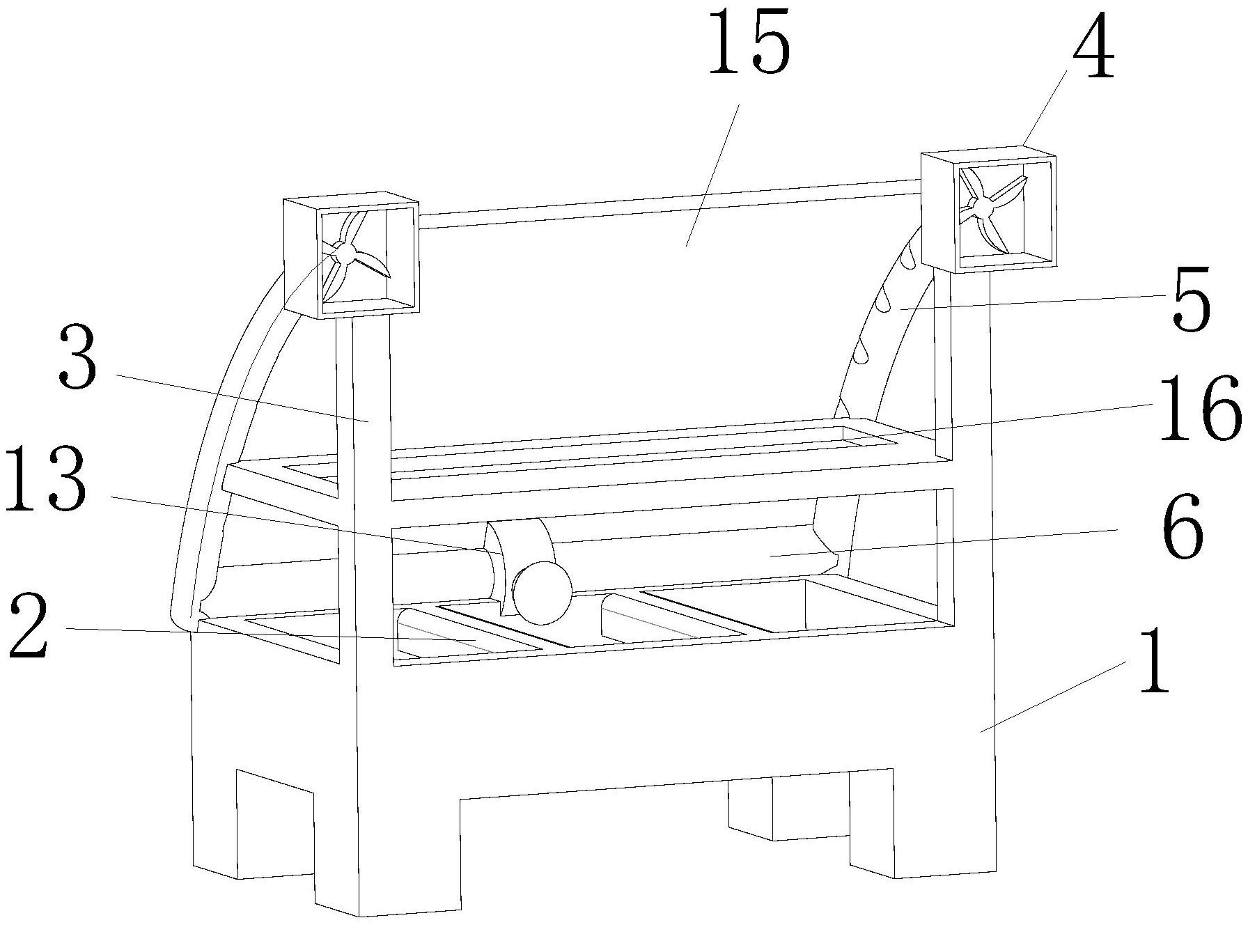 本实用新型涉及加热柜技术领域,且公开了一种可加热温炖保温饭菜的加热柜,包括主柜,所述主柜内部上端固定连接有两个支撑梁,主柜上表面左右两端固定连接有两个支撑柱,支撑柱上表面固定连接有鼓风机,进风管前表面与鼓风机后表面固定连接,出风管一端固定连接有转动环,内转动块前后表面开设有内转动孔,内转动孔内部开设有内转动槽,操作块下表面与内转动块侧表面固定连接,出风块与操作块之间夹角为一百五十度,两个出风管通过转动环插入内转动槽内部与内转动块活动连接,固定板下表面与出风管上表面固定连接,外固定块与固定板固定连接,支撑柱后边面中部固定连接有加热板,实现不仅能保温还能加热以及解冻效果。