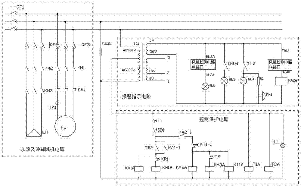 本实用新型公开了一种针对变压器烘房的新型自动防爆系统,包括加热及冷却风机电路、报警指示电路、风机检测电路和控制保护电路,加热及冷却风机电路包括空气开关、加热管支路、冷却风机支路,报警指示电路包括变压器、指示灯、蜂鸣器和风机检测信号端口,变压器初级线圈连接空气开关负载端,其次级线圈连接在指示灯两端,蜂鸣器并联在指示灯两端,风机检测电路TA接口并联在一个指示灯上,风机检测电路HL接口串联在另一个指示灯的线路上。本实用新型实现自动控制烘干时间,自动温控;操作简单,具有异常报警,异常指示;加热循环系统具有风机不转、鼓风机构脱落、风机缺相、短路过载、堵转的保护功能。