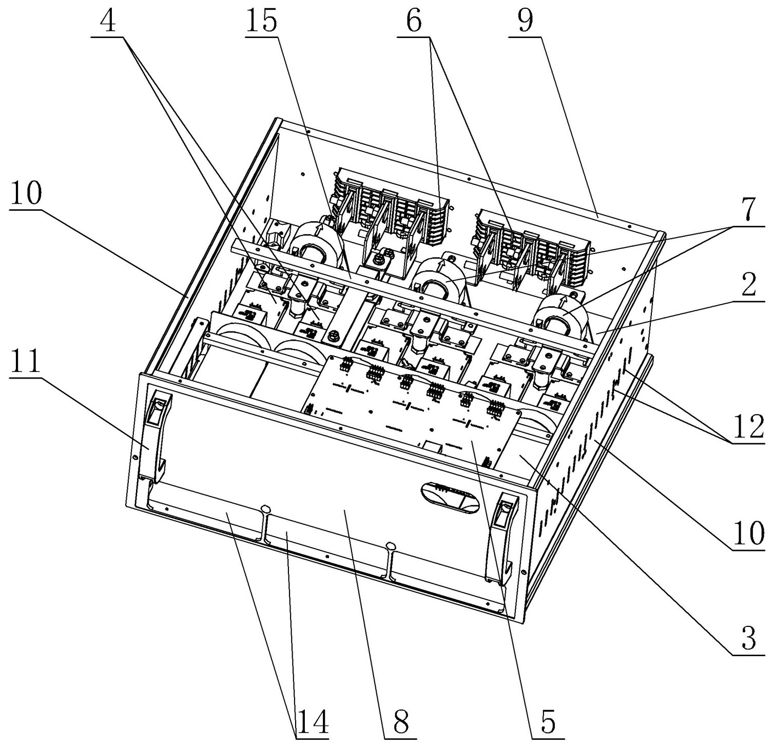 本实用新型的高可靠性、模块化和高功率密度的逆变单元,包括壳体以及位于壳体内部空腔中的散热器、电容器组件、IGBT模块和单元控制板;其特征在于:所述电容器组件和散热器由前至后分别设置于壳体内部空腔的下层,单元控制板和IGBT模块由前至后分别设置于壳体内部空腔的上层,IGBT模块固定于散热器上;壳体靠近IGBT模块的面板上固定有输入输出接线端子。本实用新型的逆变单元,不仅形成了结构紧凑的逆变单元结构,而且还有利于IGTB模块的散热,实现了对壳体内部空腔的充分利用,结构布局合理,达到了减小体积、增大单元功率密度、降低综合成本的目的。