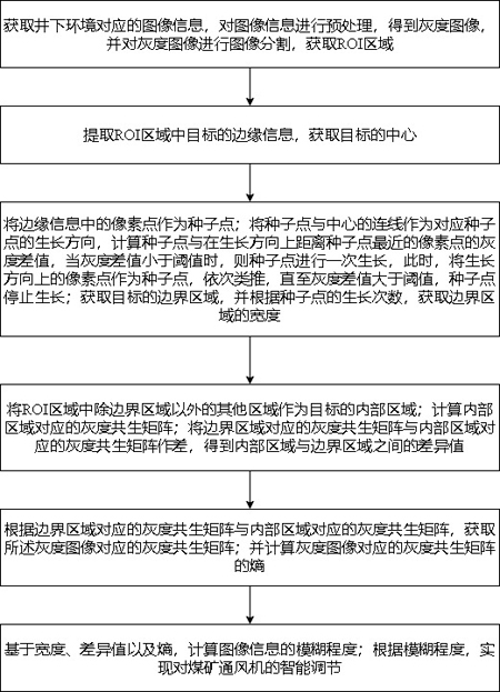 本发明涉及图像处理技术领域,具体涉及基于高压变频器的煤矿通风机智能调节方法,获取井下环境对应的图像信息,对图像信息进行预处理,得到灰度图像;获取灰度图像中的ROI区域,提取ROI区域中目标的边缘信息,将边缘信息中的像素点作为种子点;利用区域生长算法获取目标的边界区域;计算边界区域的灰度共生矩阵;根据种子点的生长次数,获取边界区域的宽度;获取目标的内部区域;计算内部区域的灰度共生矩阵,得到内部区域与边界区域之间的差异值;获取ROI区域的灰度共生矩阵;并计算ROI区域的灰度共生矩阵的熵;基于宽度、差异值以及熵,计算图像信息的模糊程度;根据模糊程度调节煤矿通风机。本发明能够精确调节煤矿通风机。