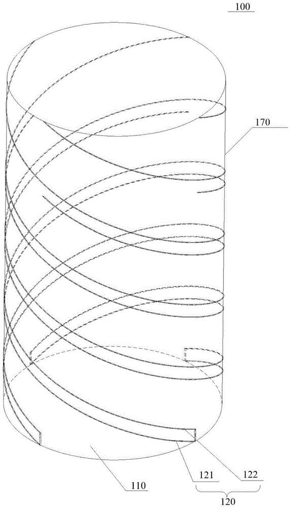本实用新型公开了一种螺旋天线,包括印制电路板以及设置在印制电路板上方的辐射主体,辐射主体包括至少一个主螺旋臂和至少一个寄生螺旋臂,每个主螺旋臂对应至少一个寄生螺旋臂,且每个主螺旋臂与其所对应的寄生螺旋臂呈平行间隔设置;其中,每个主螺旋臂的第一端与其所对应的寄生螺旋臂的第一端电连接在一起,以形成螺旋天线的馈电输出端;主螺旋臂的第二端以及寄生螺旋臂的第二端均浮接;寄生螺旋臂的长度大于与其所对应的主螺旋臂的长度,且寄生螺旋臂超出主螺旋臂的部分的螺旋升角小于寄生螺旋臂未超出主螺旋臂的部分的螺旋升角。本实用新型的螺旋天线,其频率带宽可以扩大到6%,并且,螺旋天线的结构更加紧凑。