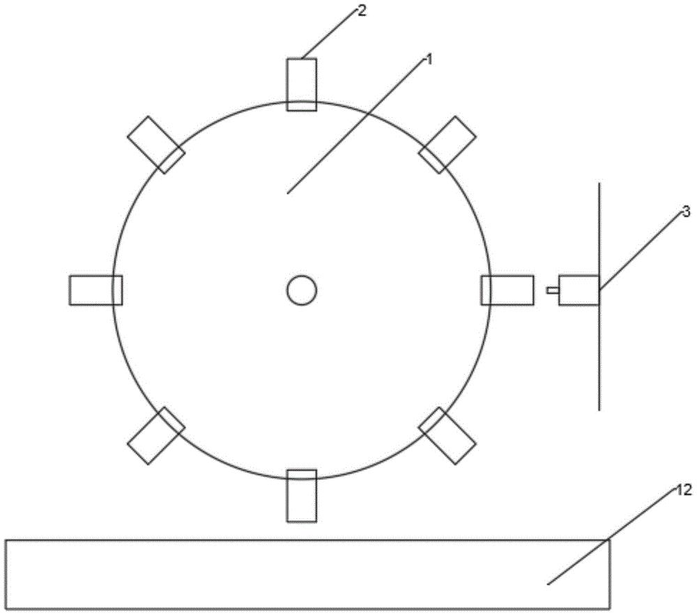 本实用新型提出一种饮料瓶冲洗装置,包括冲洗架,所述冲洗架设置为由步进电机驱动的转动轮,所述转动轮的边缘上下左右四个顶点处设置有四个饮料瓶固定架,转动轮竖直设置,正上方的饮料瓶固定架与进料通道连通,右侧饮料瓶固定架对应位置处设置有冲刷机构,正下方的饮料瓶固定架正对出料通道,与冲刷机构对应的冲洗架的内部设置有辅助冲刷机构,辅助冲刷机构不随冲洗架转动。本实用新型相对现有技术来说,将饮料瓶经过冲洗和吹气两个阶段的清洗,清洗效果更好;采用旋转式的轨道,方便排水,而且冲洗时采用专用的固定装置,使冲洗时更加稳定。