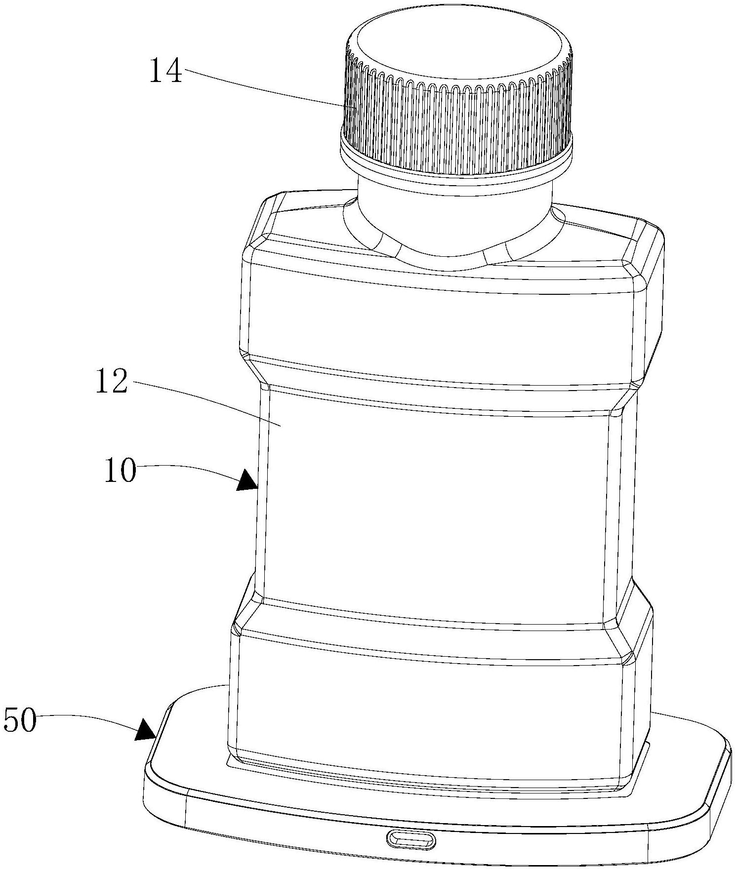 本实用新型公开了一种漱口水瓶,包括本体,所述本体包括用于盛装漱口水的瓶身和瓶盖,所述瓶盖螺纹安装到瓶身的瓶口,还包括设置到所述瓶身内的底部的臭氧生成装置,所述臭氧生成装置包括绝缘外壳、第一PCBA、电池以及用于电解漱口水以生成臭氧的臭氧生成器,所述绝缘外壳具有相互隔开的第一腔和第二腔,所述第二腔位于第一腔的上方并与所述瓶身的内部连通,所述第一PCBA和电池设置到所述第一腔内,所述臭氧生成器设置到所述第二腔内,所述电池和臭氧生成器分别与第一PCBA电连接。本实用新型可实现电解漱口水以生成臭氧,臭氧溶于漱口水中,在用户使用漱口水漱口时,臭氧随着漱口水一起进入口腔,从而达到消毒杀菌、消除口腔异味等的作用。