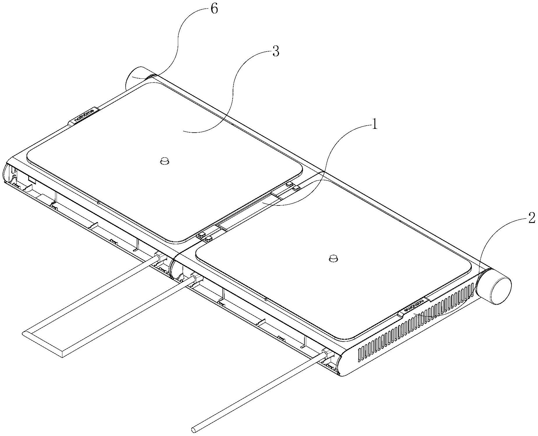 本实用新型公开了一种可拆卸折叠电磁炉及其多功能烤盘,包括壳体、盖板以及折叠连接结构,所述盖板盖合在壳体上,所述壳体、盖板和电磁驱动组件均设有两组,两组壳体和盖板之间通过折叠连接结构转动且可拆卸连接。同时还在电磁炉上设置了烤盘,所述烤盘本体在可拆卸折叠电磁炉的壳体上可拆卸设置。折叠连接结构实现了两个电磁炉壳体之间的可折叠连接与可拆卸连接,方便同步使用的同时还方便拆卸,对两个电磁炉进行单独使用,增加了电磁炉使用过程的灵活性。而设置在这种双电磁炉上的烤盘因其特殊形状和层状结构,使其不但可以与双电磁炉配套使用,增加使用面积,还可以作为菜板进行切菜,切后直接进行加工,菜板烤盘一体,增加做饭效率。