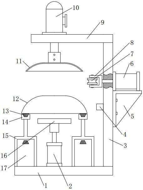 本实用新型公开了一种可快速出料的锅具生产用卷边装置,包括底座,底座的上表面一侧位置固定安装有立板,立板的顶部固定连接有水平的横板,在底座与横板之间的位置上设有用以对锅具进行传送的V型带,V型带设置有两条,两条V型带相互平行且之间留有间隙,底座的上表面两侧位置安装有支撑架,支撑架的顶部设有相互平行的导向杆,导向杆与V型带相互平行,在导向杆的上表面沿长度方向开设有V型槽,V型带滑动连接在V型槽内,本实用新型结构设计简单、使用便捷,利用传送带带动锅具移动至卷边轮处,在进行卷边工作时,可以利用气缸替代人工拿取锅具的方式,具有自动化程度高、效率高的优点,且提高了工作时的安全系数。