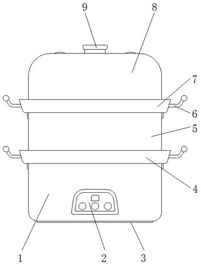 本实用新型公开了一种防水蒸气滴落的食品用蒸锅,包括放置底座,所述第一外罩和第二外罩内壁设有内槽块,其内槽块于第一外罩和第二外罩呈环形位置分布,且内槽块为弧形凹槽结构,所述第一外罩和第二外罩下端设有垫块,且垫块为硅胶材质,所述第一外罩、第二外罩和放置底座之间通过垫块呈密封连接,放置底座表面设有控制面板,且放置底座下端设有支撑垫,所述支撑垫的形状与放置底座下端的形状相匹配,且支撑垫为海绵材质。该防水蒸气滴落的食品用蒸锅的第一外罩和第二外罩内壁设有内槽块,且内槽块于第一外罩和第二外罩内呈环形分布,而且内槽块为凹槽结构,这样使得该装置的蒸汽水可以通过内壁流入到内槽块中,避免滴落,使用更方便。