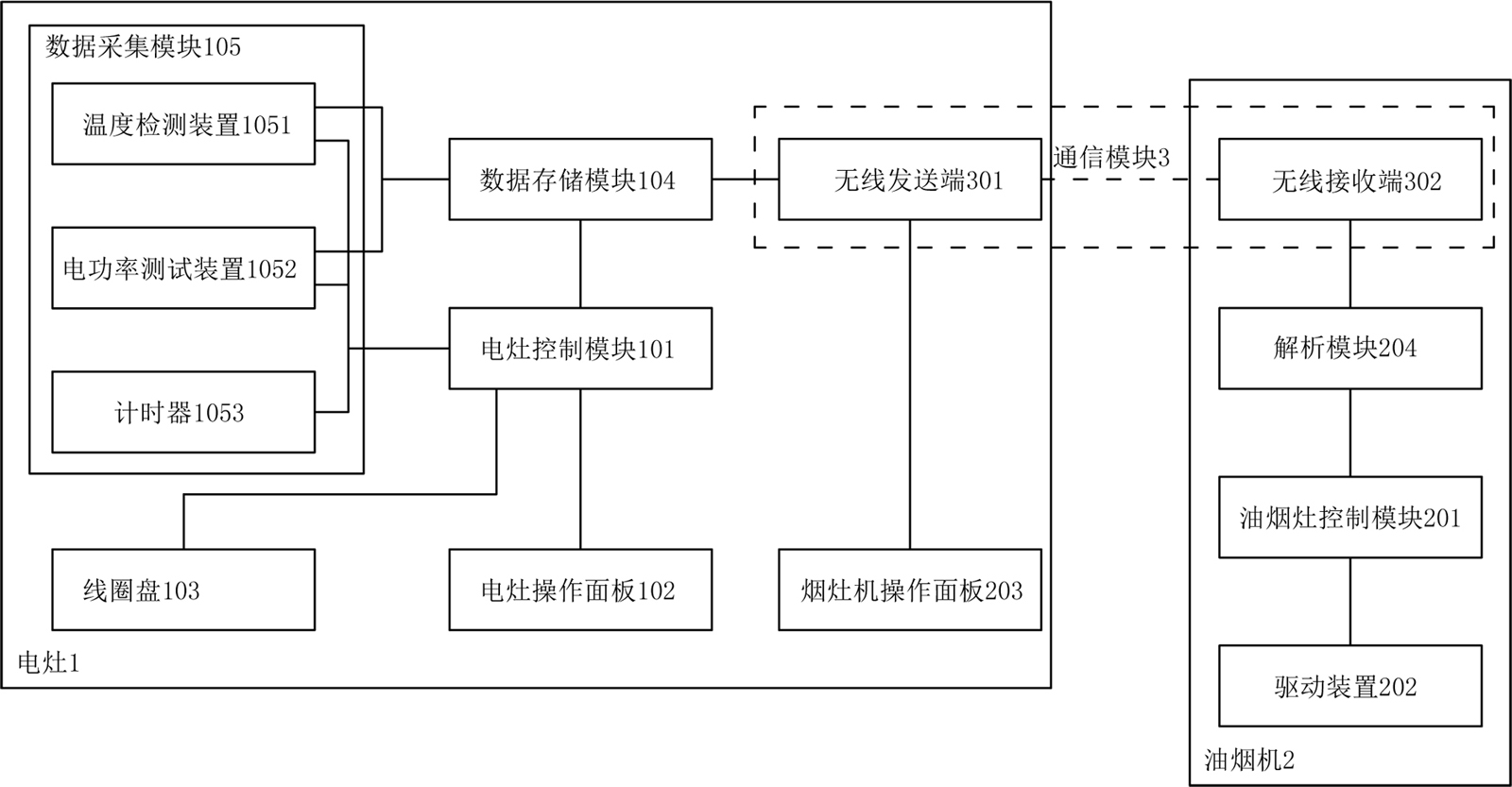 本实用新型涉及一种由电灶控制油烟机的组合厨具,通过在电灶与油烟机之间设置通信模块,将电灶上由油烟机操作面板输入的指令传送至油烟机或将数据存储模块中存储的电灶目前的工作环境中的运行数据发送至油烟机,解析模块对接收到的指令或数据进行解析并将解析后的指令或数据发送至油烟机控制模块,油烟机控制模块再对驱动装置做出相应的控制,从而实现根据电灶的使用情况调节驱动装置的工作状态,使油烟机在最优工作功率下运行,同时降低用户对油烟机的操作频率,改善用户的使用体验。