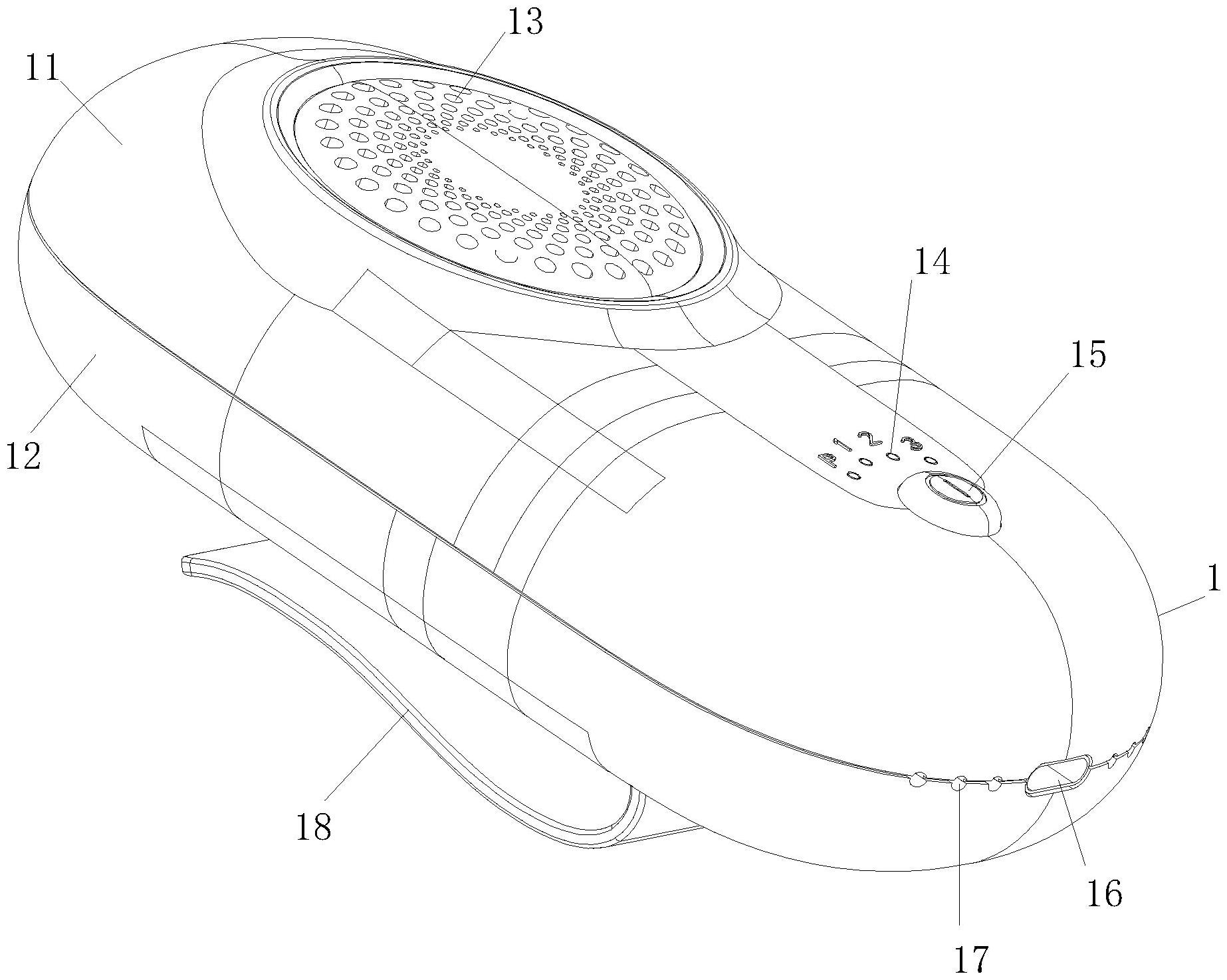 本实用新型属于除味技术领域,具体的说是一种冰箱内部用除味器,包括壳体;所述壳体包括上壳体和下壳体;所述上壳体和下壳体卡扣连接;所述上壳体中部开设有网孔,一组网孔成圆形设置;所述上壳体上设有一组挡位指示灯和按键;所述壳体底端开设有充电口;所述壳体底端开设有一组进风口,且进风口关于充电口对称分布;所述上壳体上设有PCBA,且PCBA上设有臭氧发生器;所述上壳体内固接有陶瓷臭氧发生片;所述上壳体内设有隔风罩;以解决冰箱内在放置食品后,由于食品本身的味道和一些残留的冰箱内后食品杂质会出现细菌增生,造成冰箱内存在难闻的情况,除味剂一般不能对细菌进行根除,不仅影响周边环境,还会影响之后放入的食品质量的问题。