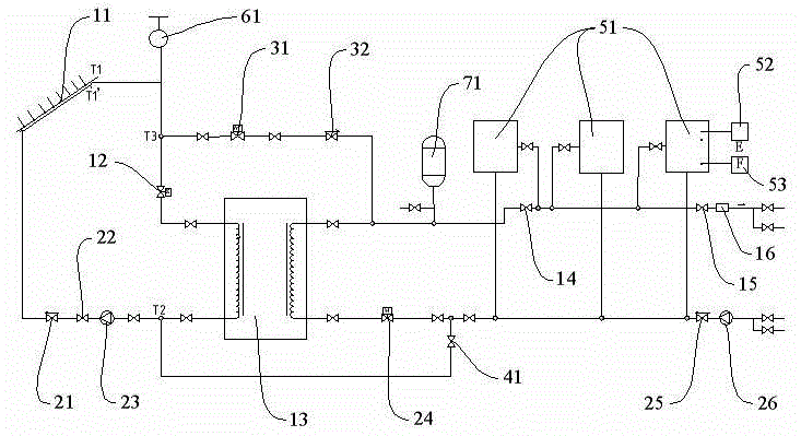 一种空气源热泵辅助太阳能集成采暖制冷供热系统,包括:供暖制冷支路、回水支路、空气源热泵支路;供暖制冷支路包括太阳能集热器以及从太阳能集热器出水口起依次连接的第一电磁阀、太阳能热泵、第一截止阀、第二截止阀、电加热器;回水支路包括从太阳能集热器进水口起依次连接的第一逆止阀、第三截止阀、太阳能循环泵、第二电磁阀、第二逆止阀、循环泵;空气源热泵支路包括空气源热泵和截止阀,在空气源热泵上联有热泵控制器和室内温控器。当夏天来临时,空气源热泵室内温控器提供信号输出,空气源热泵开始工作,冷气会用循环泵通过管路传送至室内,达到制冷效果。