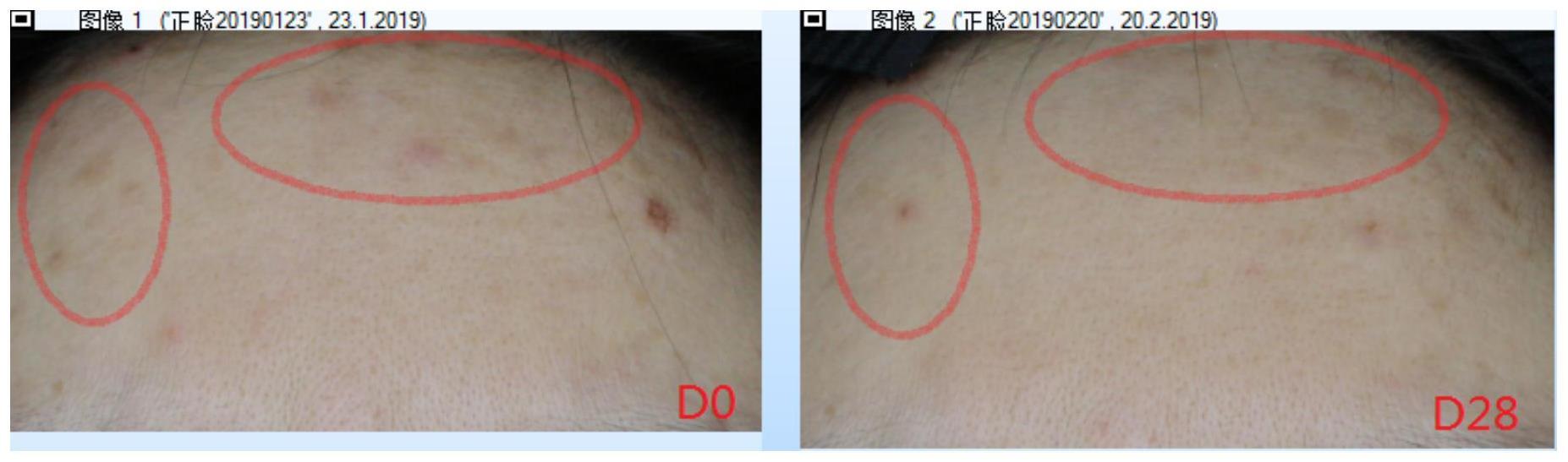 本发明公开了一种祛斑组合物和化妆品及其制备方法,涉及化妆品领域。祛斑组合物包括二乙酰基波尔定碱、十八碳烯二酸、烟酰胺、法地榄仁(TERM I NAL IA FERD I NAND IANA)果提取物、交替单胞菌发酵产物提取物、牛油果树(BUTYROSPERMUM PARKI I)果脂、橄榄油酸酯类乳化剂、辛酸/癸酸甘油三酯。本申请利用橄榄油酸酯类乳化剂帮助祛斑活性组分的在皮肤表层的渗透,二乙酸波尔定碱和十八碳烯二酸整体配合达到消除黑色素的效果,祛斑效果显著,同时祛斑组合物可以促进人皮肤成纤维细胞的增殖、修复皮肤屏障,降低皮肤敏感度。