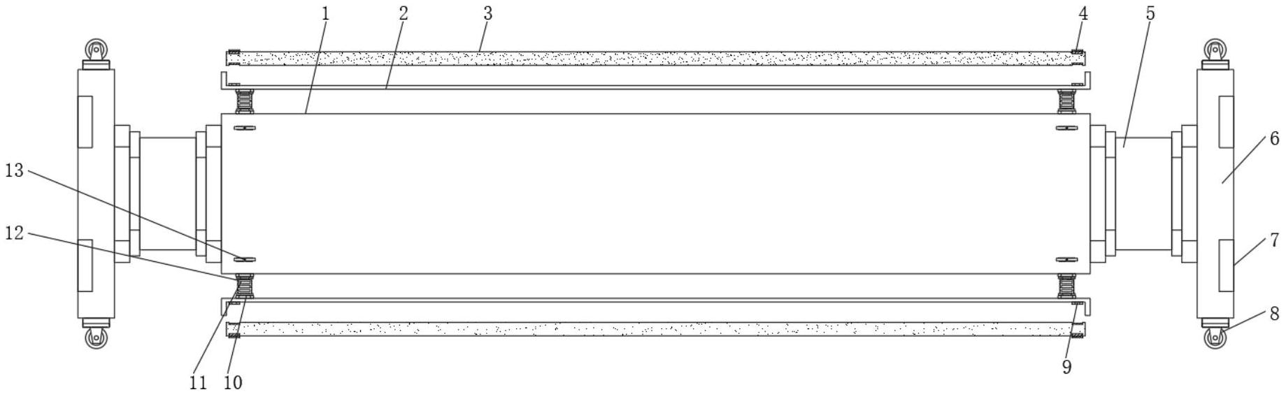本实用新型公开了一种压纸机用压纸辊,包括压纸辊本体和万向轮,所述压纸辊本体外周表面位置均匀环绕安装有若干组承载环。本实用新型通过,采用了磨砂环、调节杆,在作业时,可以根据需要处理的纸板厚度不同来对调节杆的长度进行调整,以此来适应不同的环境进行使用,接着通过固定螺栓可以对调节杆进行固定,避免在使用时发生脱落,然后在长时间的使用之后,通过将磨砂环拆卸下来更换上新的磨砂环可以对装置的摩擦部件进行快速的维护,不在需要对辊筒整体进行检修,并且由于磨砂环是独立设置的,因此人员可以根据不同的摩擦力需求来安装上不同程度的磨砂环可以适应不同的纸板需求,提高整体的使用灵活性,装置整体具有更换便捷、压距调整的优点。