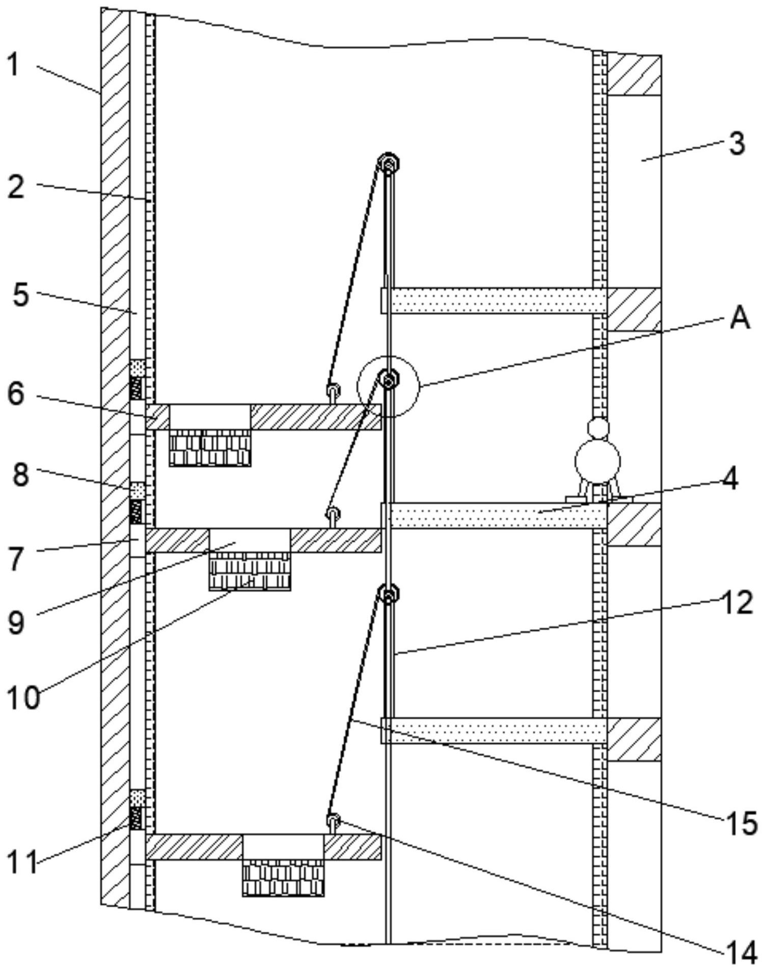 本发明公开了一种网状管道式应急逃生通道装置,包括逃生管道本体、内层防护网和逃生机构,逃生管道本体的一侧沿其长度方向等间距开设有逃生入口,每个逃生入口底端靠近逃生管道本体内部的一侧均固定有站立板,逃生管道本体位于逃生入口的对立侧并沿逃生管道本体的长度方向开设有滑槽,滑槽内位于每相邻两个站立板之间均滑动连接有逃生机构,逃生机构包括滑动连接于滑槽内的滑块、固定在滑块上并与逃生管道本体的轴向垂直的升降板和用于驱动升降板升降的驱动机构,本发明无需利用电力设备,通过人力采用动力机构驱动逃生机构升降来实现将逃生者运输至底层,而逃生机构一次可以运输多人,使用过程中较为安全,提高了逃生机构的利用效率。