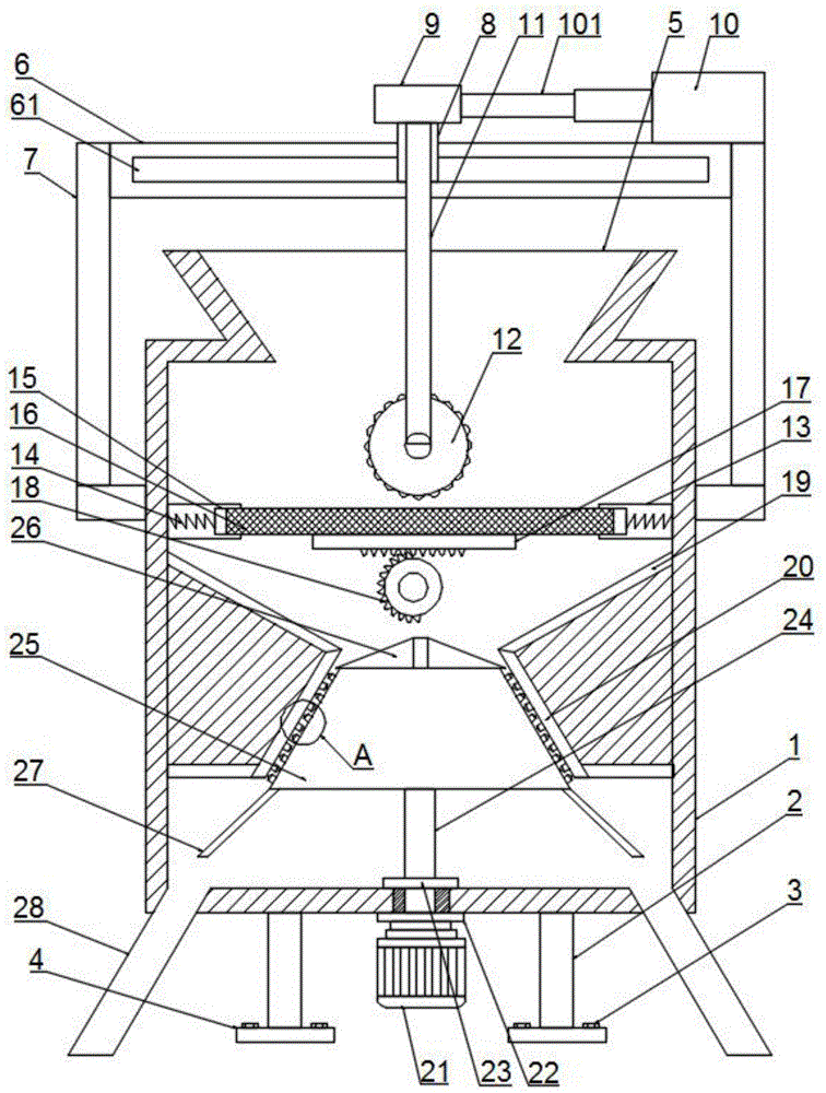 本实用新型涉及一种涂料生产用上料装置,特别涉及涂料生产设备技术领域。本实用新型包括箱体、支撑腿、进料斗、横板、支架、滑块、连接块、气缸、连接杆、研磨轮、滑套、弹簧、框架、筛网、齿条、扇形齿轮、研磨室、电机、转轴、研磨辊、分料块、分料口,所述横板上设有所述滑槽,所述滑槽内设有与所述滑槽相匹配的所述滑块,所述研磨轮下方设有所述筛网,所述筛网周围通过所述框架固定而成,所述研磨辊外壁上设有第二研磨齿,所述研磨室内壁上设有第一研磨齿,所述研磨辊底部两侧均设有向下倾斜的第二导料板,所述二导料板下端延伸至所述分料口内。通过上料时同时实现对原料的研磨、筛分,无需人工再次转移,节约时间,提高工作效率。
