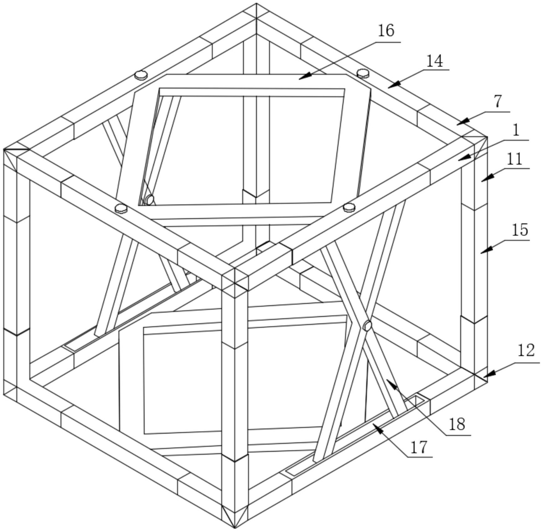 本实用新型公开了一种便于组装的轻钢建筑的定位钢架,属于建筑材料技术领域,其包括第一安装架,所述第一安装架的数量为八个,所述第一安装架的右侧面固定连接有第一楔形块,所述第一楔形块的右侧面开设有第一卡槽,所述第一楔形块的下表面开设有第二卡槽,所述第一卡槽的内壁与第一卡块的外表面相互卡接。该便于组装的轻钢建筑的定位钢架,通过设置第一楔形块、第一卡槽、第一卡块、第二卡块和第三卡块,该钢架在安装的过程中通过卡接的方式对钢架进行安装,与传统的螺栓固定相比,可以避免螺栓在长时间的使用过程中由于螺栓腐蚀从而出现安装不牢固的情况,且该钢架通过卡接的方式进行安装,便于工作人员对该钢架进行快速拆装。
