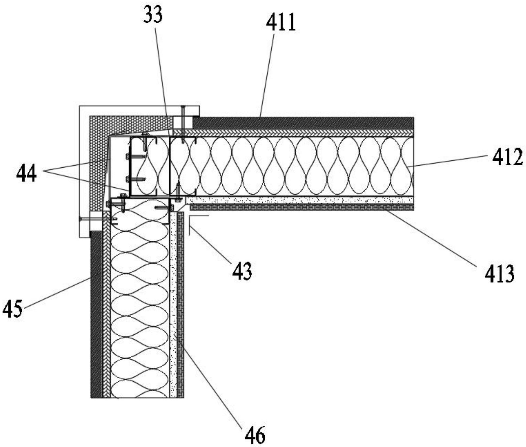 本实用新型提出一种冷弯薄壁型钢模块化集成房屋的L型墙体,包括遮挡部以及连接于所述遮挡部的分隔部;所述遮挡部包括第三外墙装饰层、第三中间层以及第三内墙装饰层,遮挡部的第三外墙装饰层连接于遮挡部的第三中间层的外侧,遮挡部的第三内墙装饰层连接于第三中间层的内侧;分隔部包括第三外墙装饰层、第三中间层以及第三内墙装饰层,分隔部的第三外墙装饰层连接于分隔部的第三中间层的外侧,分隔部的第三内墙装饰层连接于分隔部的第三中间层的内侧,所述遮挡部还包括两个C型竖向龙骨以及两个L型连接件;所述遮挡部的两个C型竖向龙骨装设于所述遮挡部与所述分隔部连接的一端,所述两个L型连接件与所述遮挡部的两个C型竖向龙骨连接。