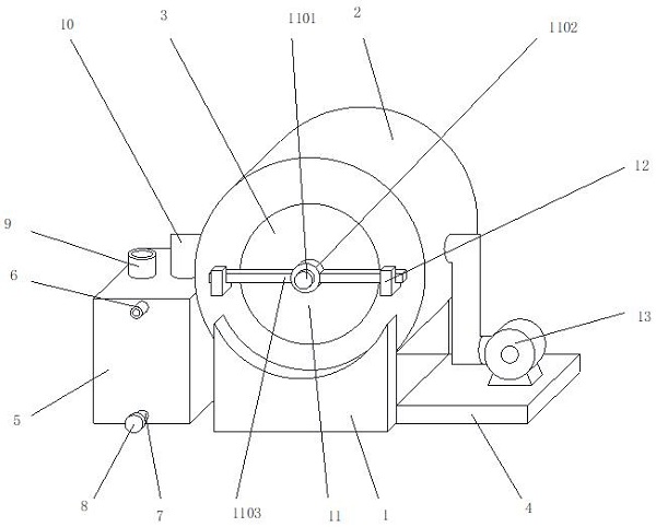 本申请公开了一种炭黑烘干机,包括炭黑烘干壳体、水箱、排气结构、通气结构、挡杆结构和装料结构,所述炭黑烘干壳体的正面和背面的外侧壁上固定连接支撑架,所述支撑架右侧的外侧壁上固定连接支撑板,所述支撑板和炭黑烘干壳体上设置有热风结构。本申请转动电机带动固定架转动,便于不断的对需要烘干的炭黑颗粒进行翻动,加快其烘干效率,本申请抽风扇进行抽风,通气细管将炭黑粉末通入水箱的水中,便于较好的对翻动过程中产生的炭黑粉末进行处理,避免其污染环境,本申请通过通气细管将通风管通入的气体分割成几路通入水中,可减小通入水中的单个气泡的体积,便于使得炭黑粉末可较好的溶于水中。