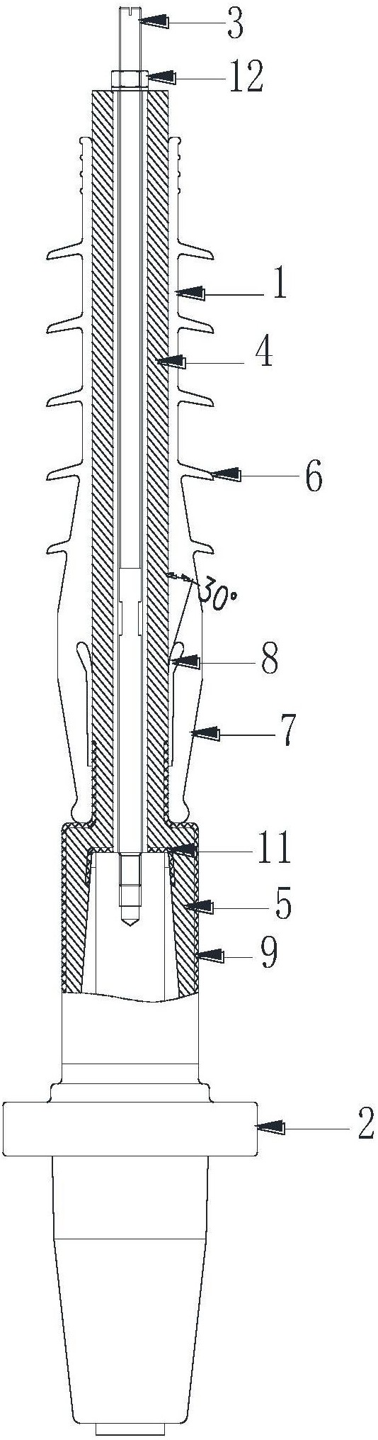 本实用新型涉及一种试验工装,尤其是涉及一种伞裙试验工装。包括工装本体,工装本体一端为设备出线套管,另一端与设备出线套管连接有用于放置螺杆的绝缘长套管,所述绝缘长套管外壁均匀设有用于实验时均匀电场的若干伞裙。因此,本实用新型具有如下优点:1.工装外部伞裙有效的延长放电距离,整个工装不需要制作的过长;2.工装内外屏蔽层和应力锥可以均匀电场结构,可进行局放试验(应力锥角度在25°‑35°之间时效果最好);3.装入螺杆后拧紧螺母,安装方便,便于携带。