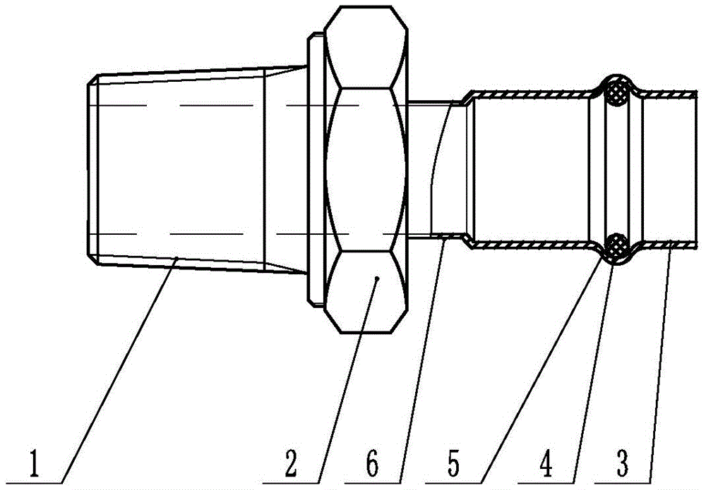 本实用新型涉及一种抗菌不锈钢外螺纹转换接头,属于不锈钢管件技术领域。本实用新型解决了现有不锈钢管件存在的连接困难、连接过程繁琐的问题。本实用新型一种抗菌不锈钢外螺纹转换接头,包括外螺纹部,外螺纹部后端设置有拧紧部,拧紧部后端设置有插接部;所述的插接部后端设置有环状凸起,环状凸起内壁上设置有密封圈;密封圈的内径小于插接部的内径。本实用新型具有管件连接方便的有益效果。