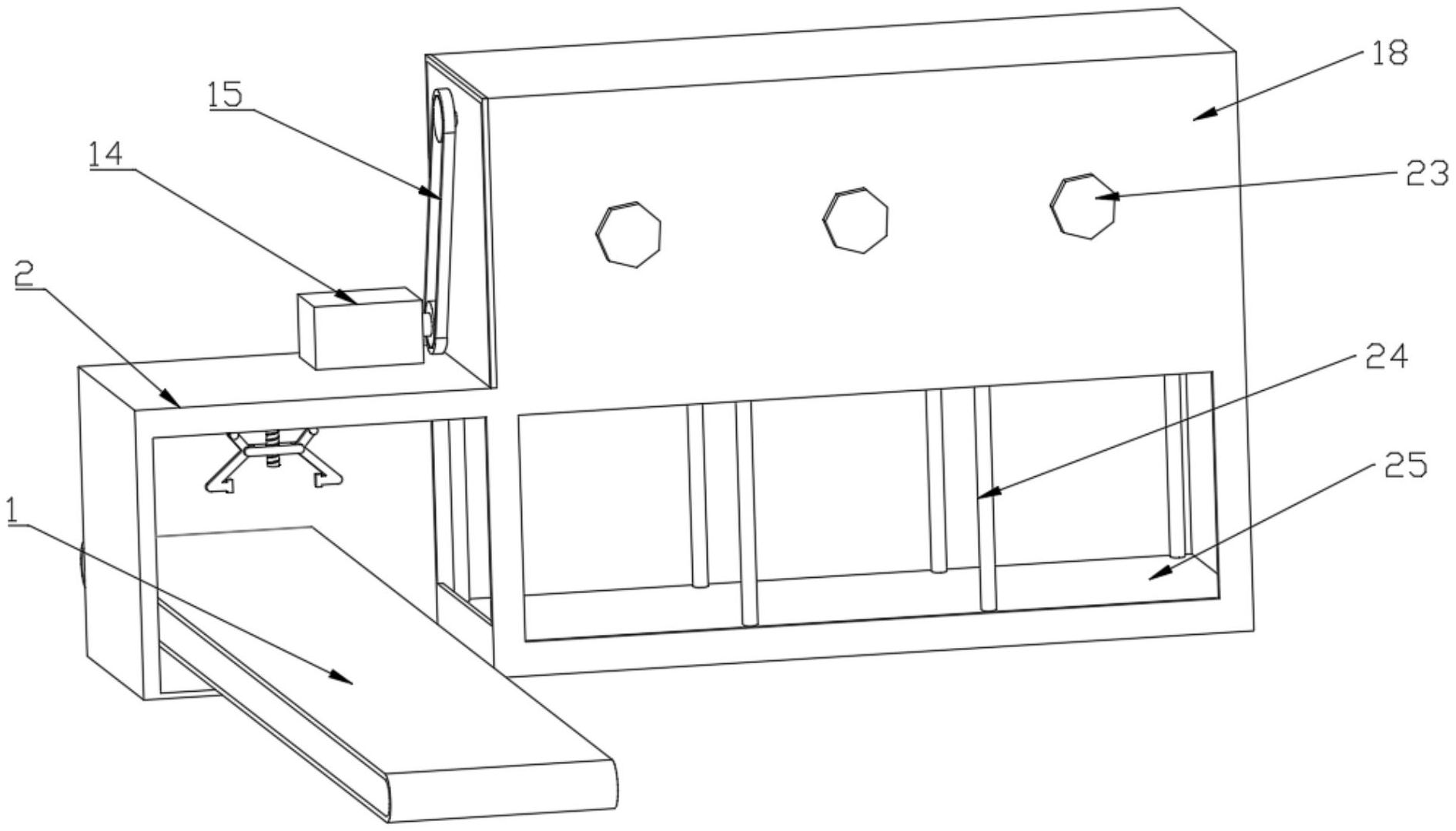 本实用新型公开了一种办公家具生产烘干的技术领域的一种办公家具生产用烘干装置,包括传送带,传送带前端设有夹取箱,夹取箱上端设有滑槽,滑槽内部中间固定设有滑道,滑道上滑动套合有滑动车,滑动车俩侧设有驱动轮,驱动轮再滑槽内滑动,滑动车底部一侧固定设有驱动电机,滑动车底部中间固定设有轴承垫,轴承垫两侧铰接两枚第一连杆一端,两枚第一连杆另一端铰接两枚夹具一端,两枚夹具中部均铰接第二连杆两端,第二连杆中部螺纹连接第一螺杆一端,第一螺杆另一端一处固定连接转盘,第一螺杆另一端顶部转动连接轴承垫,通过本实用新型解决传统烘干需要人工运输到烘干房内烘干流程,实现大批量的烘干,无需搬运,降低人工成本。