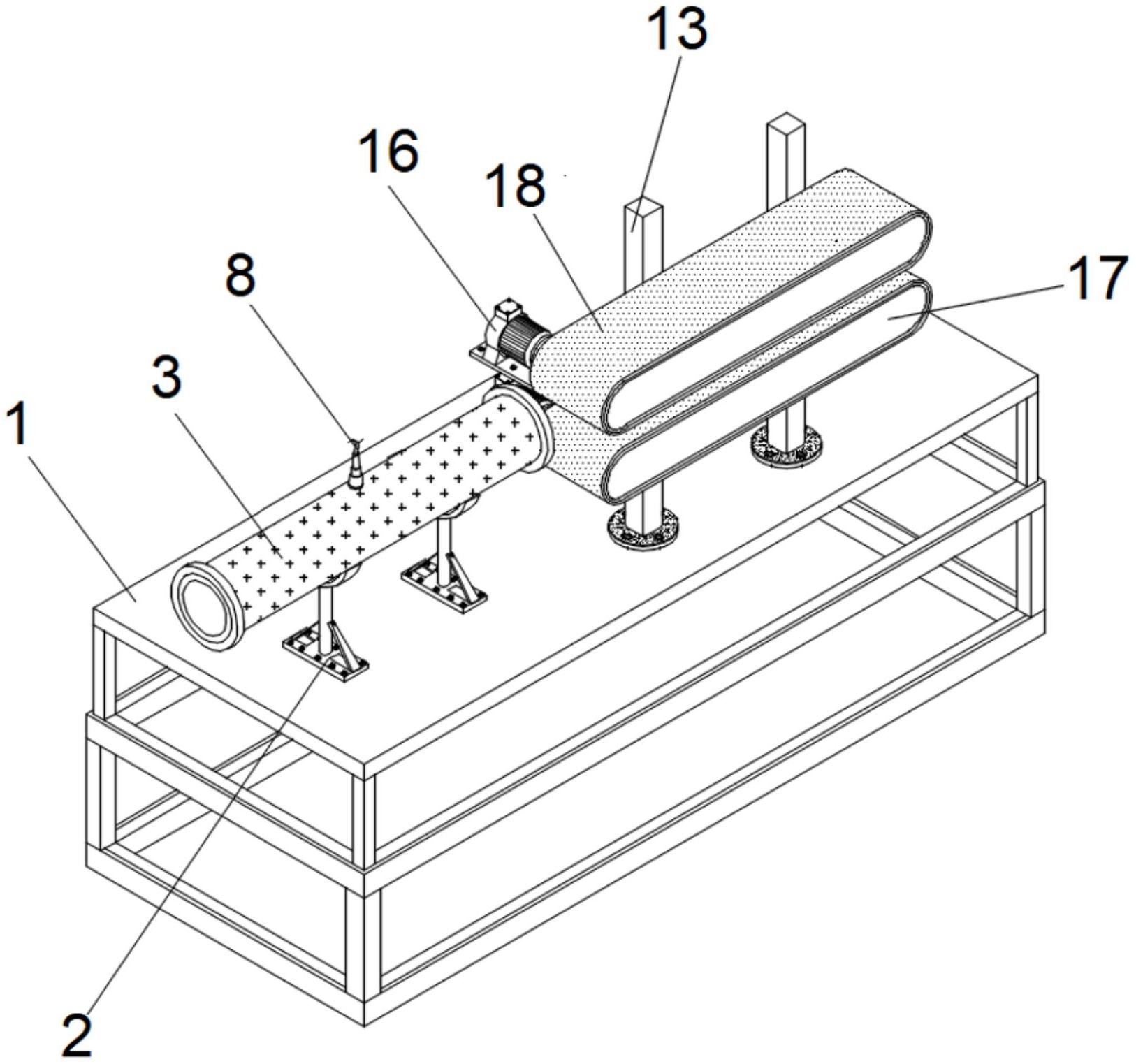 本实用新型涉及塑料管材生产设备技术领域,公开了一种塑料管材牵引装置,包括牵引台,所述牵引台的顶部固定连接有支架,所述支架的顶部固定连接有冷却腔,所述冷却腔的内壁固定连接连接有散热层,所述散热层的内壁固定连接有支柱。本实用新型具有以下优点和效果:冷却腔内部充满水,使冷却腔的内部温度较低,支柱将散热腔与散热层进行连接,使中间留有间隙,更利于散热,水从注水管流进散热腔,散热腔的内部同样充满水,工作人员将管材从散热腔内部穿过,管材在经过散热腔,通过散热层和水温对管材进行降温,通风孔径便于内部的空气流通,提高散热的效果,管材遇冷外表面硬度增加,便于管材的定型,且在牵引时不易变形。