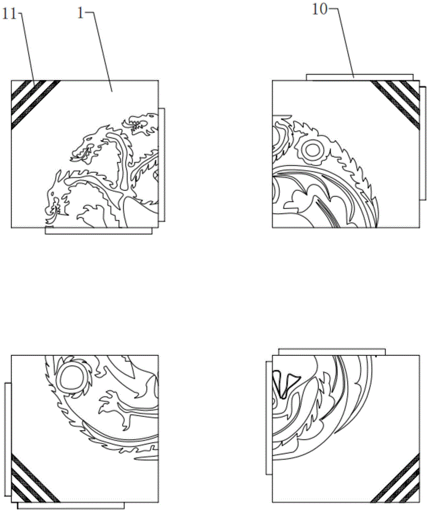 本实用新型的一种拼花木板,包括四个带花木板,四个带花木板的背面共同开设有固形槽,固形槽中放置有金属件,四个带花木板的固形槽中竖直一体设置有限位柱,圆形金属件上开设有供限位柱穿插的限位槽,限位柱与限位槽过盈连接。其能不降低拼花木板强度的同时,减少拼花木板的材料,减低拼花木板的成本。