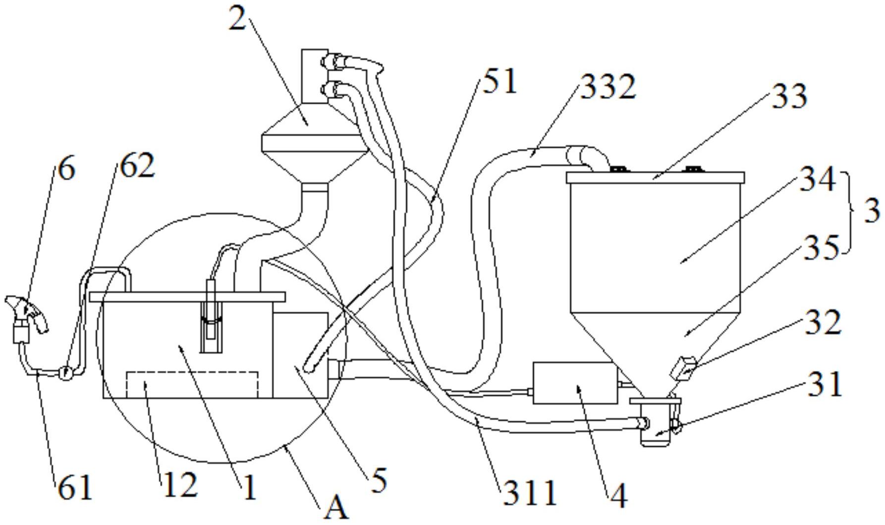 本实用新型提供了一种供粉系统及静电喷涂设备,涉及静电喷涂领域,供粉系统包括:第一盛料机构、第二盛料机构、回收装置、检测机构和控制器;第一盛料机构通过回收粉管与回收装置连通,回收装置用于将回收粉输送至第一盛料机构内;第二盛料机构上设置有第一粉泵,第一粉泵用于将第二盛料机构内的新粉输送至第一盛料机构;检测机构设置于第一盛料机构内;检测机构与控制器连接,控制器与第一粉泵连接,检测机构用于检测第一盛料机构内混合粉的高度信息,并将高度信息传递至控制器,当第一盛料机构内的混合粉的高度大于或者等于检测机构所处的高度时,控制器控制第一粉泵关闭,从而使喷枪在不同时间喷涂的工件基本无色差。